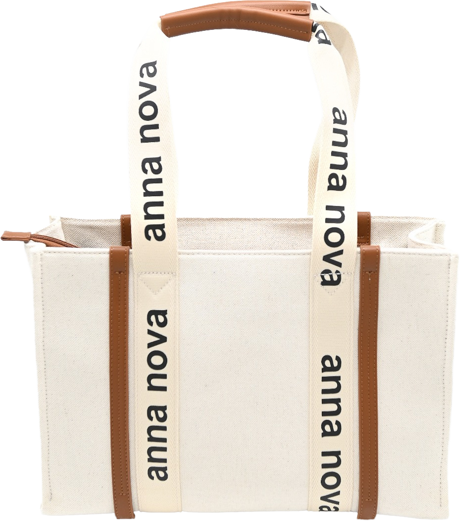 Crafted from durable canvas with contrasting tan faux-leather details, this tote blends clean minimalism with modern functionality. The bold anna nova logo straps add a chic designer touch while providing comfortable shoulder carry.