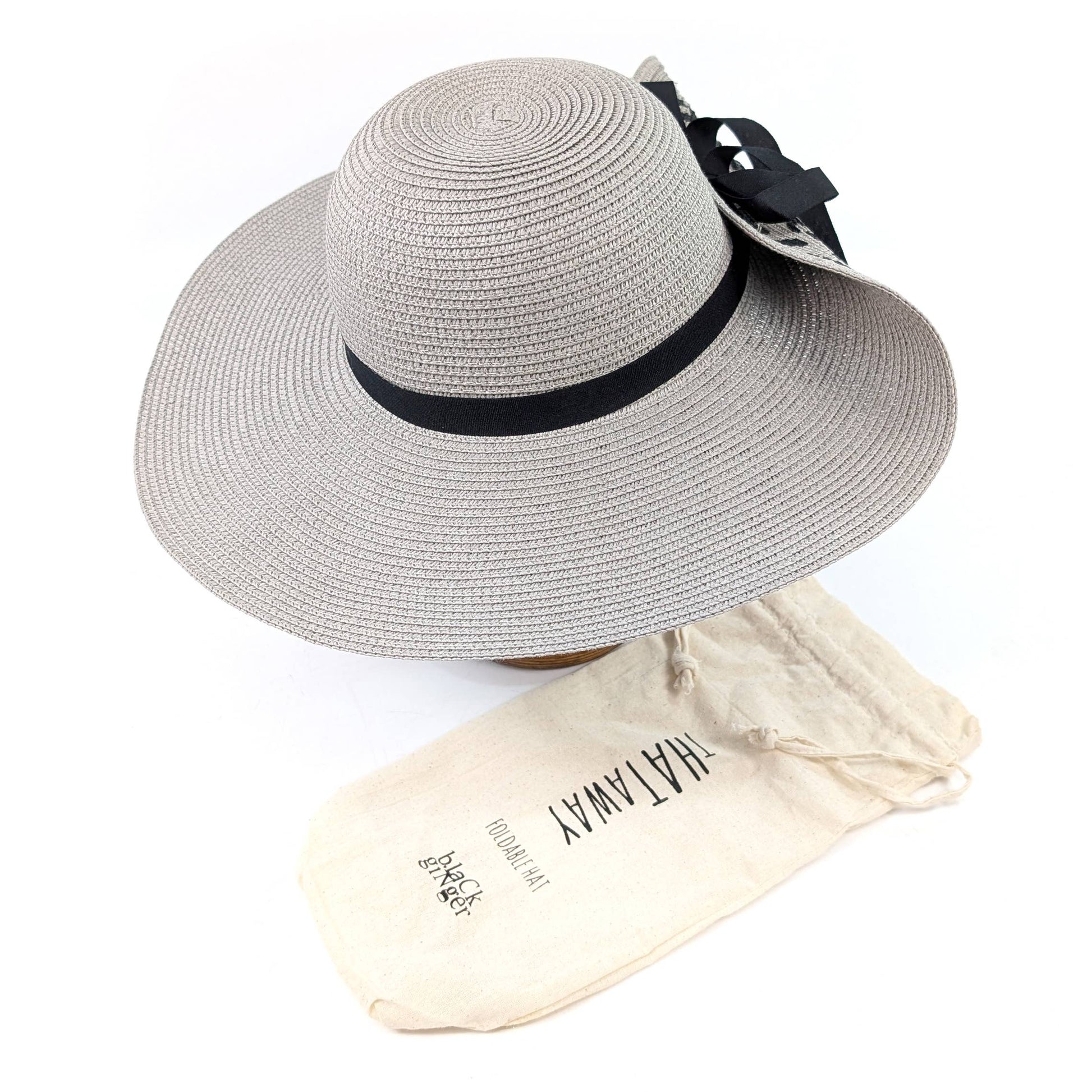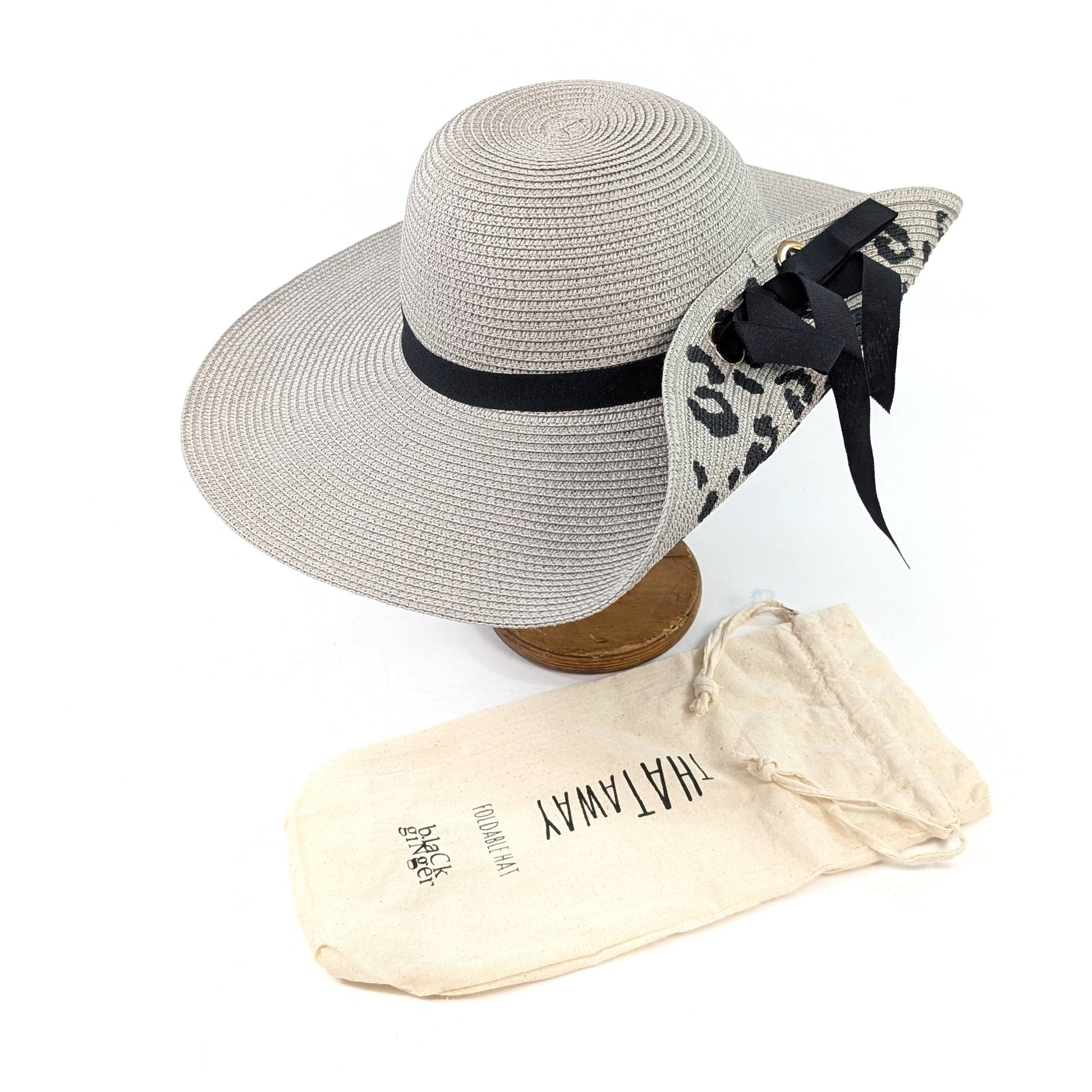 This hat features Wide brimmed hat but using a ribbon to fold the back up. Black ribbon decoration and tie. The underside of the brim has a black animal print. Extra sun protection and the flexibility of the fold-up.. It's the perfect companion for sunny days, combining style, practicality, and eco-friendly design.