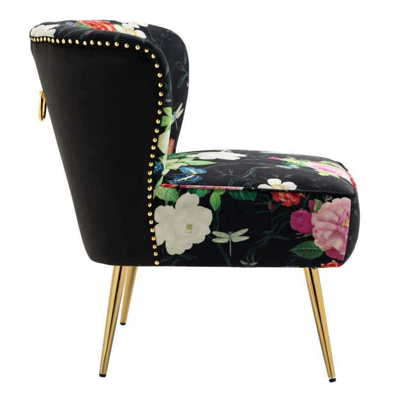 Make a bold and beautiful statement with this striking accent chair, featuring a dramatic midnight black background adorned with pink roses and delicate butterflies. Designed to instantly elevate your space, this eye-catching piece brings together romance, elegance and contemporary flair.
